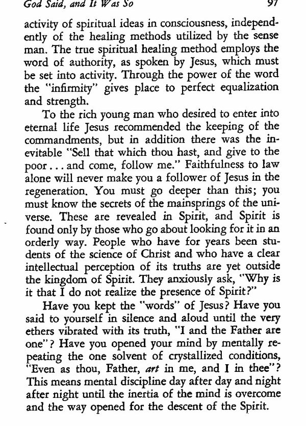 Have you kept the "words" of Jesus? Have you said to yourself in silence and aloud until the very ethers vibrated with its truth, "I and the Father are one"? Have you opened your mind by mentally repeating the one solvent of crystallized conditions, "Even as thou, Father, art in me, and I in thee"? This means mental discipline day after day and night after night until the inertia of the mind is overcome and the way opened for the descent of Spirit.