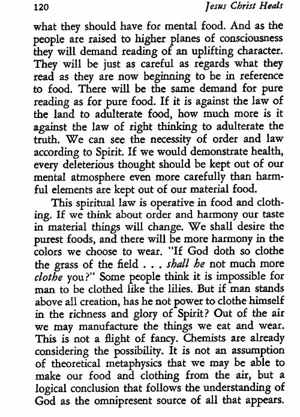 This spiritual law is operative in food and clothing. If we think about order and harmony our taste in material things will change. We shall desire the purest foods, and there will be more harmony in the colors we choose to wear. "If God doth so clothe the grass of the field . . . shall he not much more clothe you?" Some people think it is impossible for man to be clothed like the lilies. But if man stands above all creation, has he not power to clothe himself in the richness and glory of Spirit? Out of the air we may manufacture the things we eat and wear. This is not a flight of fancy. Chemists are already considering the possibility. It is not an assumption of theoretical metaphysics that we may be able to make our food and clothing from the air, but a logical conclusion that follows the understanding of God as the omnipresent source of all that appears.