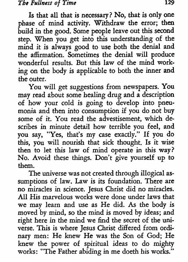 Is that all that is necessary? No, that is only one phase of mind activity. Withdraw the error; then build in the good. Some people leave out this second step. When you get into this understanding of the mind it is always good to use both the denial and the affirmation. Sometimes the denial will produce wonderful results. But this law of the mind working on the body is applicable to both the inner and the outer.