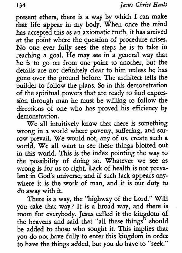 ethers, there is a way by which I can make that life appear in my body. When once the mind has accepted this as an axiomatic truth, it has arrived at the point where the question of procedure arises. No one ever fully sees the steps he is to take in reaching a goal. He may see in a general way that he is to go on from one point to another, but the details are not definitely clear to him unless he has gone over the ground before. The architect tells the builder to follow the plans. So in this demonstration of the spiritual powers that are ready to find expression through man he must be willing to follow the directions of one who has proved his efficiency by demonstration.