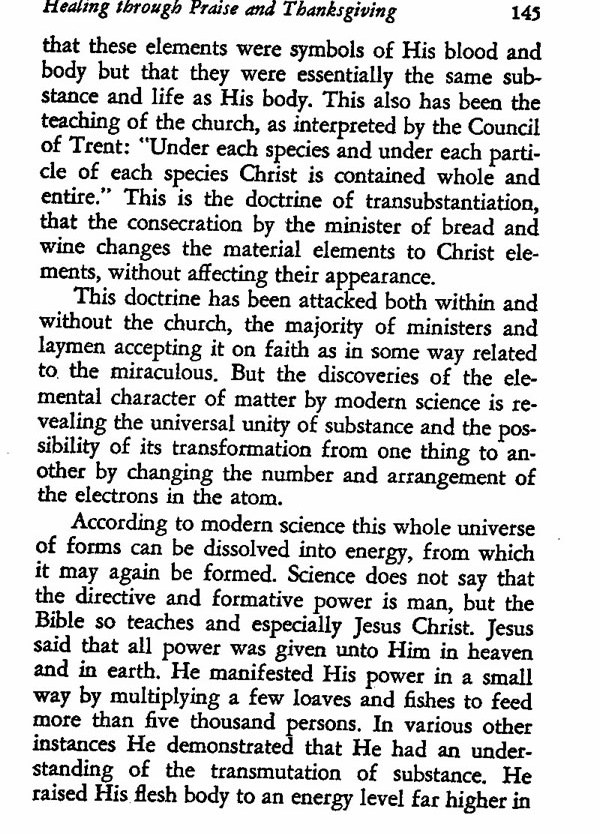This doctrine has been attacked both within and without the church, the majority of ministers and laymen accepting it on faith as in some way related to the miraculous. But the discoveries of the elemental character of matter by modern science are revealing the universal unity of substance and the possibility of its transformation from one thing to another by changing the number and arrangement of the electrons in the atom.