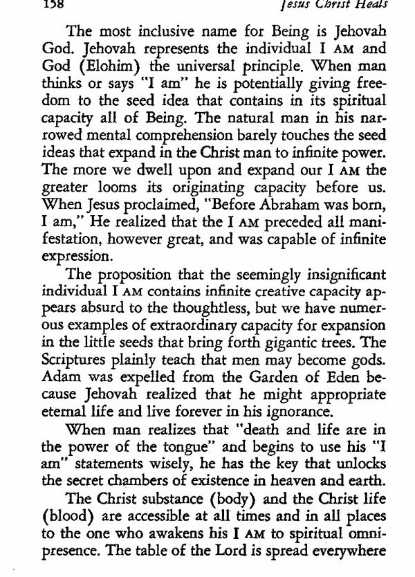 The most inclusive name for Being is Jehovah God. Jehovah represents the individual I AM and God (Elohim) the universal Principle. When man thinks or says "I am" he is potentially giving freedom to the seed ideas that contains in its spiritual capacity all of Being. The natural man in his narrowed mental comprehension barely touches the seed ideas that expand in the Christ man to infinite power. The more we dwell upon and expand our I AM the greater looms its originating capacity before us. When Jesus proclaimed, "Before Abraham was born, I am," He realized that the I AM preceded all manifestation, however great, and was capable of infinite expression.