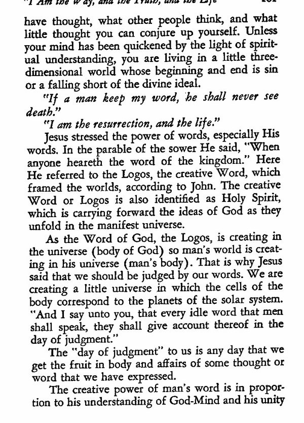As the Word of God, the Logos, is creating in the universe (body of God) so man's word is creating in his universe (man's body). That is why Jesus said that we should be judged by our words. We are creating a little universe in which the cells of the body correspond to the planets of the solar system. "And I say unto you, that every idle word that men shall speak, they shall give account thereof in the day of judgment."