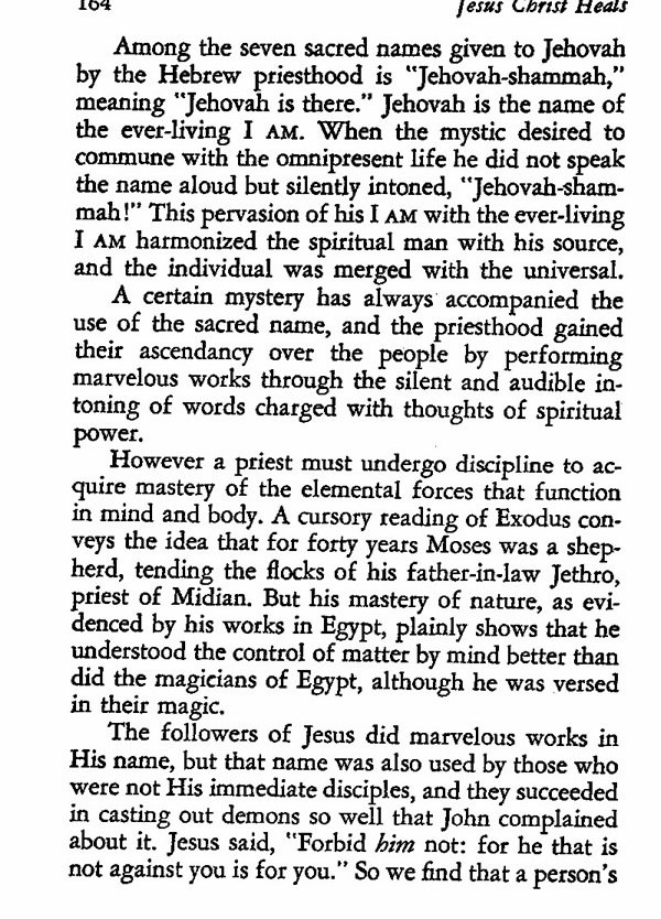 Among the seven sacred names given to Jehovah by the Hebrew priesthood is "Jehovah-shammah," meaning "Jehovah is there." Jehovah is the name of the ever-living I AM. When the mystic desired to commune with the omnipresent life he did not speak the name aloud but silently intoned, "Jehovah-shammah!" This pervasion of his I AM with the ever-living I AM harmonized the spiritual man with his source, and the individual was merged with the universal.