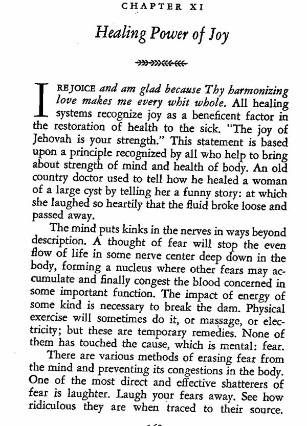 I REJOICE and am glad because Thy harmonizing love makes me every whit whole. All healing systems recognize joy as a beneficent factor in the restoration of health to the sick. "The joy of Jehovah is your strength." This statement is based on a principle recognized by all who help to bring about strength of mind and health of body. An old country doctor used to tell how he healed a woman of a large cyst by telling her a funny story: at which she laughed so heartily that the fluid broke loose and passed away.