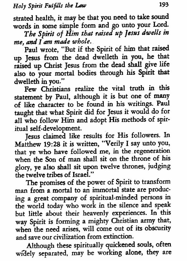 The Spirit of Him that raised up Jesus dwells in me, and I am made whole. Paul wrote, "But if the Spirit of him that raised up Jesus from the dead dwelleth in you, he that raised up Christ Jesus from the dead shall give life also to your mortal bodies through his Spirit that dwelleth in you." Few Christians realize the vital truth in this statement by Paul, although it is but one of many of like character to be found in his writings. Paul taught that what Spirit did for Jesus it would do for all who follow Him and adopt His methods of spiritual self-development.