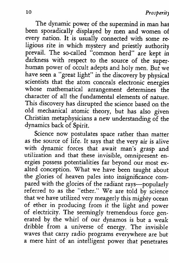 Science now postulates space rather than matter as the source of life. It says that the very air is alive with dynamic forces that await man's grasp and utilization and that these invisible, omnipresent energies possess potentialities far beyond our most exalted conception. What we have been taught about the glories of heaven pales into insignificance compared with the glories of the radiant rays--popularly referred to as the "ether." We are told by science that we have utilized very meagerly this mighty ocean of ether in producing from it the light and power of electricity. The seemingly tremendous force generated by the whirl of our dynamos is but a weak dribble from a universe of energy. The invisible waves that carry radio programs everywhere are but a mere hint of an intelligent power that penetrates