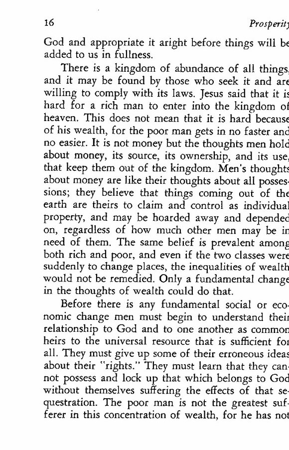 Before there is any fundamental social or economic change men must begin to understand their relationship to God and to one another as common heirs to the universal resource that is sufficient for all. They must give up some of their erroneous ideas about their "rights." They must learn that they cannot possess and lock up that which belongs to God without themselves suffering the effects of that sequestration. The poor man is not the greatest sufferer in this concentration of wealth, for he has not