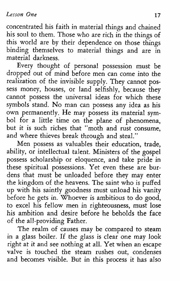Every thought of personal possession must be dropped out of mind before men can come into the realization of the invisible supply. They cannot possess money, houses, or land selfishly, because they cannot possess the universal ideas for which these symbols stand. No man can possess any idea as his own permanently. He may possess its material symbol for a little time on the plane of phenomena, but it is such riches that "moth and rust consume, and where thieves break through and steal."