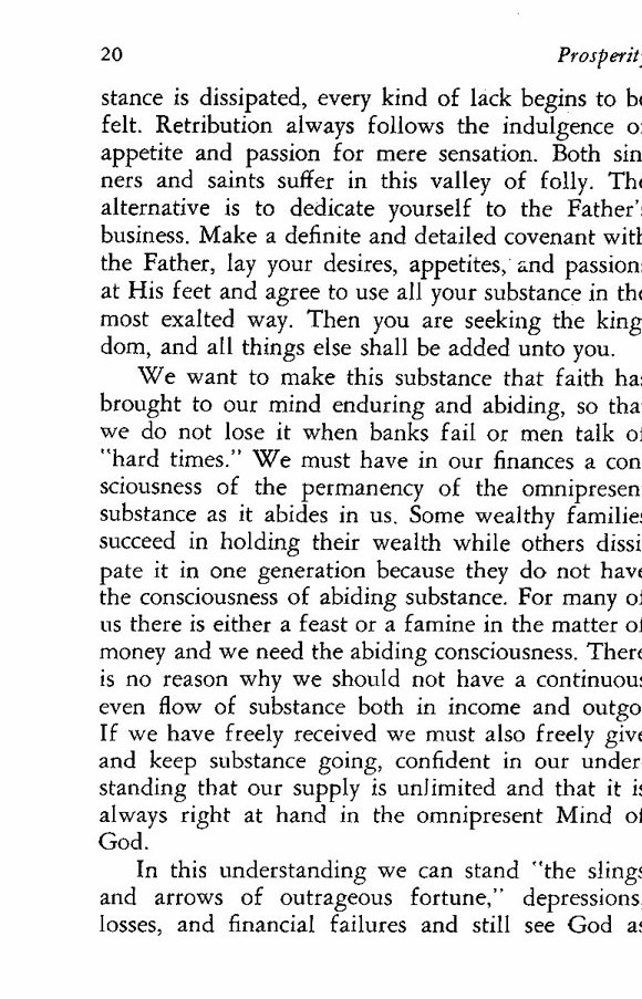 We want to make this substance that faith has brought to our mind enduring and abiding, so that we do not lose it when banks fail or men talk of "hard times." We must have in our finances a consciousness of the permanency of the omnipresent substance as it abides in us. Some wealthy families succeed in holding their wealth while others dissipate it in one generation because they do not have the consciousness of abiding substance. For many of us there is either a feast or a famine in the matter of money and we need the abiding consciousness. There is no reason why we should not have a continuous even flow of substance both in income and outgo. If we have freely received we must also freely give and keep substance going, confident in our understanding that our supply is unlimited and that it is always right at hand in the omnipresent Mind of God.