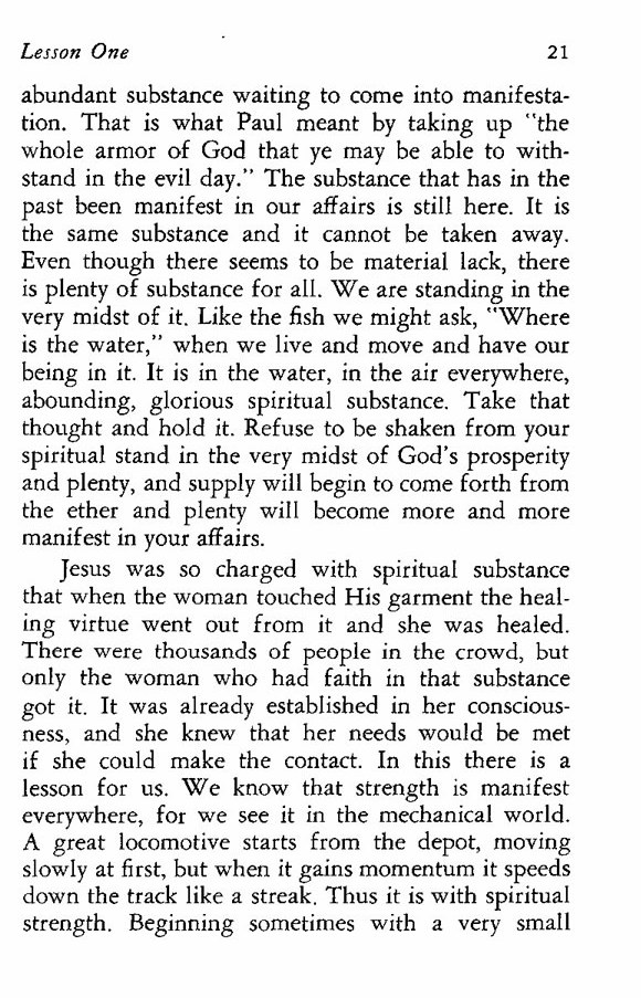 abundant substance waiting to come into manifestation. That is what Paul meant by taking up "the whole armor of God that ye may be able to withstand in the evil day." The substance that has in the past been manifest in our affairs is still here. It is the same substance and it cannot be taken away. Even though there seems to be material lack, there is plenty of substance for all. We are standing in the very midst of it. Like the fish we might ask, "Where is the water," when we live and move and have our being in it. It is in the water, in the air everywhere, abounding, glorious spiritual substance. Take that thought and hold it. Refuse to be shaken from your spiritual stand in the very midst of God's prosperity and plenty, and supply will begin to come forth from the ether and plenty will become more and more manifest in your affairs.