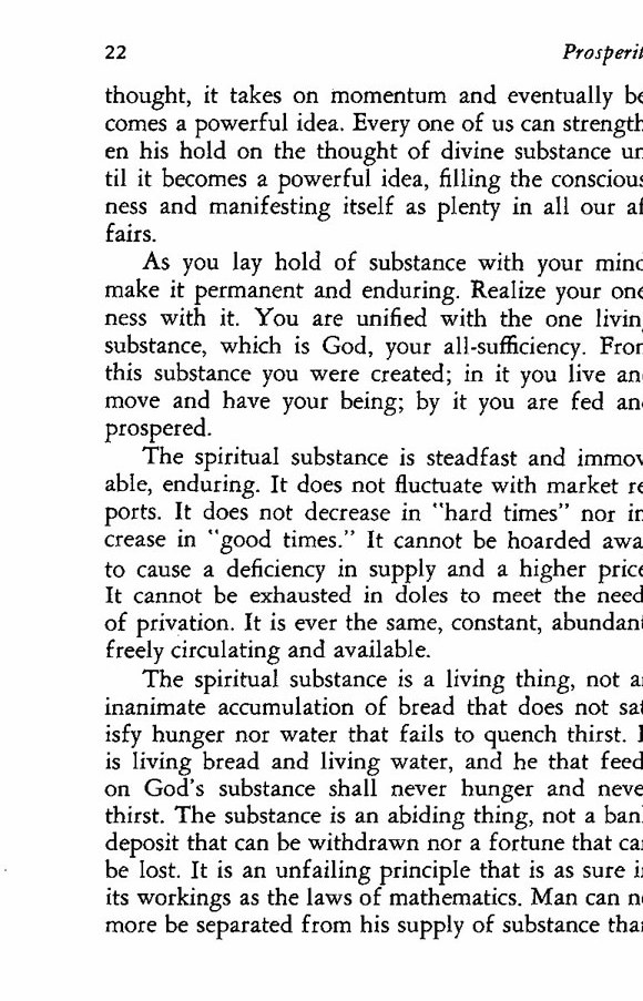 As you lay hold of substance with your mind, make it permanent and enduring. Realize your oneness with it. You are unified with the one living substance, which is God, your all-sufficiency. From this substance you were created; in it you live and move and have your being; by it you are fed and prospered.