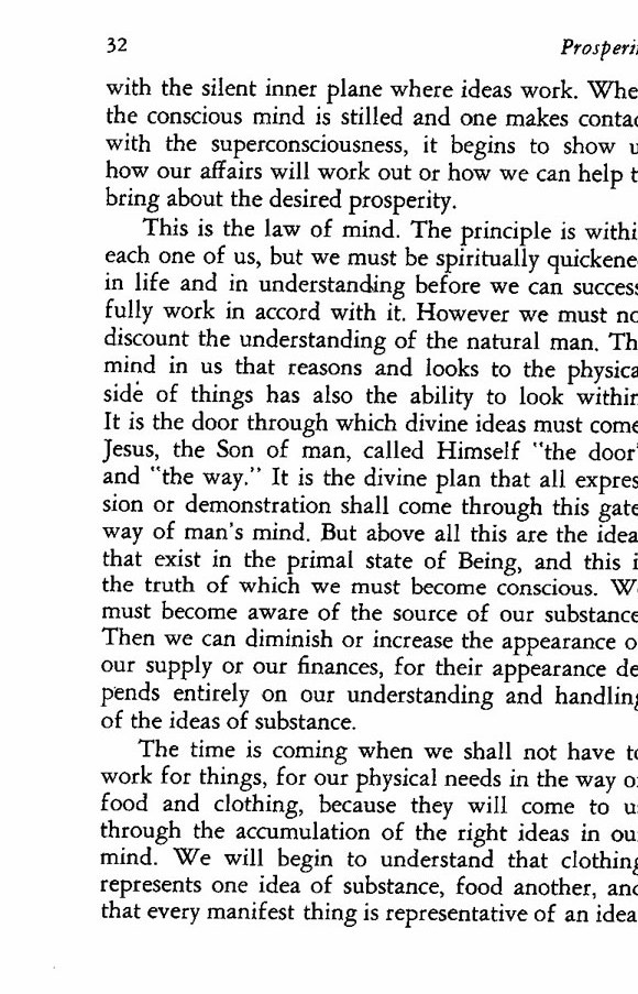 with the silent inner plane where ideas work. When the conscious mind is stilled and one makes contact with the superconsciousness, it begins to show us how our affairs will work out or how we can help to bring about the desired prosperity.