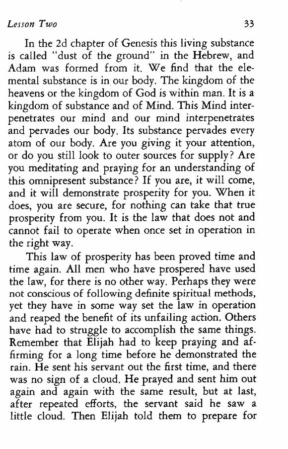 In the 2d chapter of Genesis this living substance is called "dust of the ground" in the Hebrew, and Adam was formed from it. We find that the elemental substance is in our body. The kingdom of the heavens or the kingdom of God is within man. It is a kingdom of substance and of Mind. This Mind interpenetrates our mind and our mind interpenetrates and pervades our body. Its substance pervades every atom of our body. Are you giving it your attention, or do you still look to outer sources for supply? Are you meditating and praying for an understanding of this omnipresent substance? If you are, it will come, and it will demonstrate prosperity for you. When it does, you are secure, for nothing can take that true prosperity from you. It is the law that does not and cannot fail to operate when once set in operation in the right way.