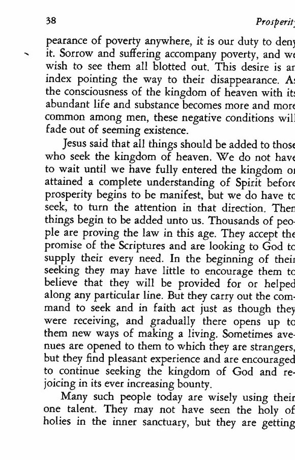 Jesus said that all things should be added to those who seek the kingdom of heaven. We do not have to wait until we have fully entered the kingdom or attained a complete understanding of Spirit before prosperity begins to be manifest, but we do have to seek, to turn the attention in that direction. Then things begin to be added unto us. Thousands of people are proving the law in this age. They accept the promise of the Scriptures and are looking to God to supply their every need. In the beginning of their seeking they may have little to encourage them to believe that they will be provided for or helped along any particular line. But they carry out the command to seek and in faith act just as though they were receiving, and gradually there opens up to them new ways of making a living. Sometimes avenues are opened to them to which they are strangers, but they find pleasant experience and are encouraged to continue seeking the kingdom of God and rejoicing in its ever increasing bounty.