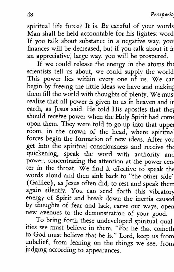 If we could release the energy in the atoms the scientists tell us about, we could supply the world. This power lies within every one of us. We can begin by freeing the little ideas we have and making them fill the world with thoughts of plenty. We must realize that all power is given to us in heaven and in earth, as Jesus said. He told His apostles that they should receive power when the Holy Spirit had come upon them. They were told to go up into that upper room, in the crown of the head, where spiritual forces begin the formation of new ideas. After you get into the spiritual consciousness and receive the quickening, speak the word with authority and power, concentrating the attention at the power center in the throat. We find it effective to speak the words aloud and then sink back to "the other side" (Galilee), as Jesus often did, to rest and speak them again silently. You can send forth this vibratory energy of Spirit and break down the inertia caused by thoughts of fear and lack, carve out ways, open new avenues to the demonstration of your good.
