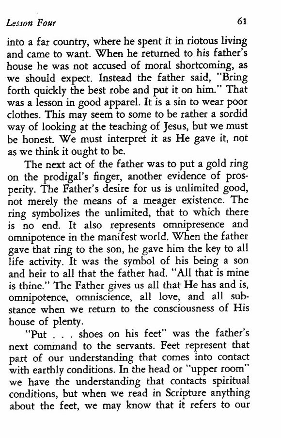 The next act of the father was to put a gold ring on the prodigal's finger, another evidence of prosperity. The Father's desire for us is unlimited good, not merely the means of a meager existence. The ring symbolizes the unlimited, that to which there is no end. It also represents omnipresence and omnipotence in the manifest world. When the father gave that ring to the son, he gave him the key to all life activity. It was the symbol of his being a son and heir to all that the father had. "All that is mine is thine." The Father gives us all that He has and is, omnipotence, omniscience, all love, and all substance when we return to the consciousness of His house of plenty.