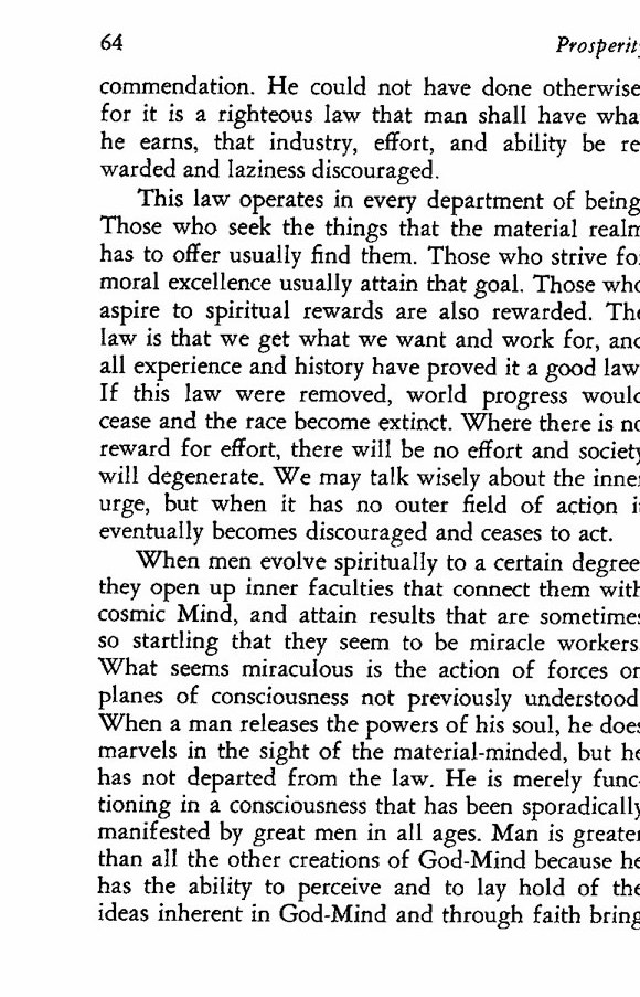 When men evolve spiritually to a certain degree, they open up inner faculties that connect them with cosmic Mind, and attain results that are sometimes so startling that they seem to be miracle workers. What seems miraculous is the action of forces on planes of consciousness not previously understood. When a man releases the powers of his soul, he does marvels in the sight of the material-minded, but he has not departed from the law. He is merely functioning in a consciousness that has been sporadically manifested by great men in all ages. Man is greater than all the other creations of God-Mind because he has the ability to perceive and to lay hold of the ideas inherent in God-Mind and through faith bring