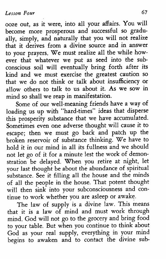 Some of our well-meaning friends have a way of loading us up with "hard-times" ideas that disperse this prosperity substance that we have accumulated. Sometimes even one adverse thought will cause it to escape; then we must go back and patch up the broken reservoir of substance thinking. We have to hold it in our mind in all its fullness and we should not let go of it for a minute lest the work of demonstration be delayed. When you retire at night, let your last thought be about the abundance of spiritual substance. See it filling all the house and the minds of all the people in the house. That potent thought will then sink into your subconsciousness and continue to work whether you are asleep or awake.