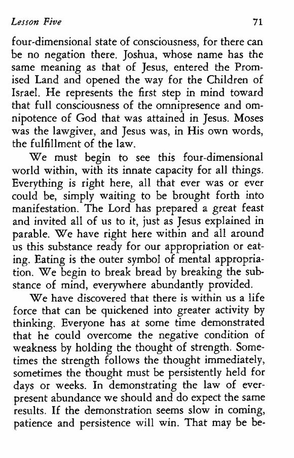 four-dimensional state of consciousness, for there can be no negation there. Joshua, whose name has the same meaning as that of Jesus, entered the Promised Land and opened the way for the Children of Israel. He represents the first step in mind toward that full consciousness of the omnipresence and omnipotence of God that was attained in Jesus. Moses was the lawgiver, and Jesus was, in His own words, the fulfillment of the law.