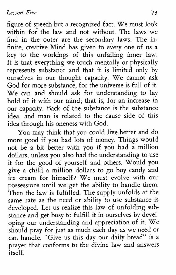 figure of speech but a recognized fact. We must look within for the law and not without. The laws we find in the outer are the secondary laws. The infinite, creative Mind has given to every one of us a key to the workings of this unfailing inner law. It is that everything we touch mentally or physically represents substance and that it is limited only by ourselves in our thought capacity. We cannot ask God for more substance, for the universe is full of it. We can and should ask for understanding to lay hold of it with our mind; that is, for an increase in our capacity. Back of the substance is the substance idea, and man is related to the cause side of this idea through his oneness with God.