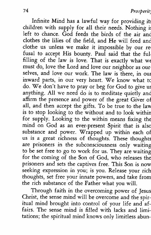 Infinite Mind has a lawful way for providing its children with supply for all their needs. Nothing is left to chance. God feeds the birds of the air and clothes the lilies of the field, and He will feed and clothe us unless we make it impossible by our refusal to accept His bounty. Paul said that the fulfilling of the law is love. That is exactly what we must do, love the Lord and love our neighbor as ourselves, and love our work. The law is there, in our inward parts, in our very heart. We know what to do. We don't have to pray or beg for God to give us anything. All we need do is to meditate quietly and affirm the presence and power of the great Giver of all, and then accept the gifts. To be true to the law is to stop looking to the without and to look within for supply. Looking to the within means fixing the mind on God as an ever-present Spirit that is also substance and power. Wrapped up within each of us is a great richness of thoughts. These thoughts are prisoners in the subconsciousness only waiting to be set free to go to work for us. They are waiting for the coming of the Son of God, who releases the prisoners and sets the captives free. This Son is now seeking expression in you; is you. Release your rich thoughts, set free your innate powers, and take from the rich substance of the Father what you will.