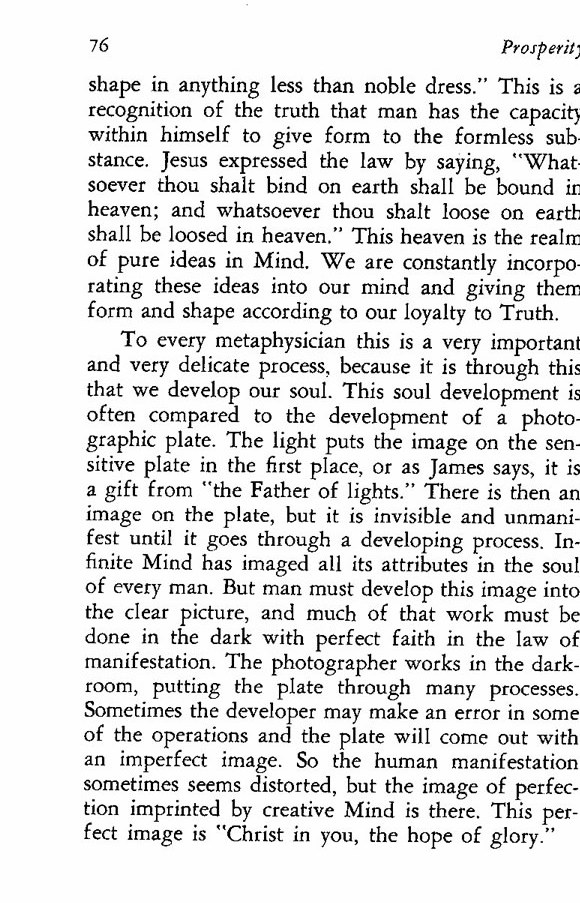 To every metaphysician this is a very important and very delicate process, because it is through this that we develop our soul. This soul development is often compared to the development of a photographic plate. The light puts the image on the sensitive plate in the first place, or as James says, it is a gift from "the Father of lights." There is then an image on the plate, but it is invisible and unmanifest until it goes through a developing process. Infinite Mind has imaged all its attributes in the soul of every man. But man must develop this image into the clear picture, and much of that work must be done in the dark with perfect faith in the law of manifestation. The photographer works in the darkroom, putting the plate through many processes. Sometimes the developer may make an error in some of the operations and the plate will come out with an imperfect image. So the human manifestation sometimes seems distorted, but the image of perfection imprinted by creative Mind is there. This perfect image is "Christ in you, the hope of glory."