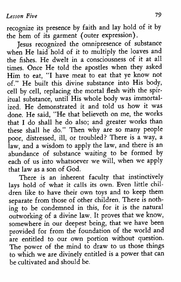 Jesus recognized the omnipresence of substance when He laid hold of it to multiply the loaves and the fishes. He dwelt in a consciousness of it at all times. Once He told the apostles when they asked Him to eat, "I have meat to eat that ye know not of." He built this divine substance into His body, cell by cell, replacing the mortal flesh with the spiritual substance, until His whole body was immortalized. He demonstrated it and told us how it was done. He said, "He that believeth on me, the works that I do shall he do also; and greater works than these shall he do." Then why are so many people poor, distressed, ill, or troubled? There is a way, a law, and a wisdom to apply the law, and there is an abundance of substance waiting to be formed by each of us into whatsoever we will, when we apply that law as a son of God.