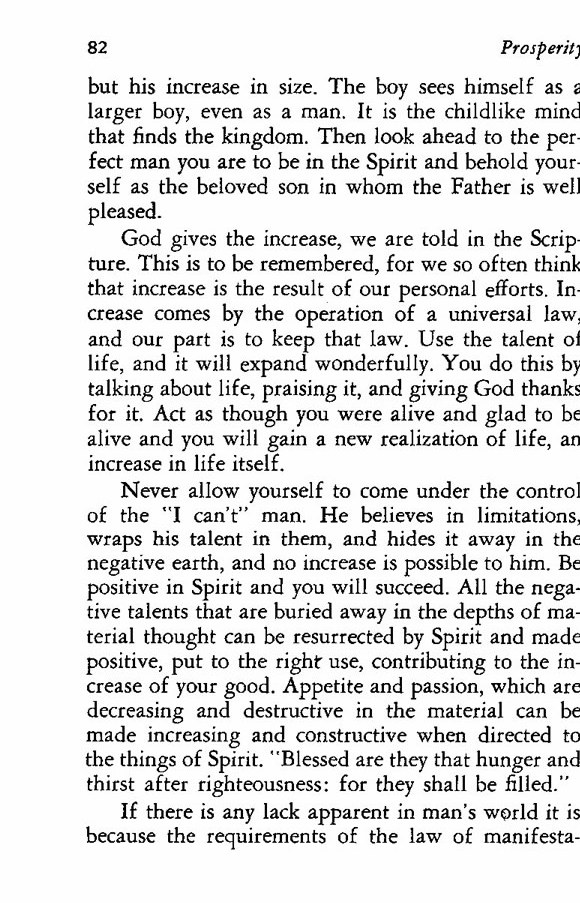 Never allow yourself to come under the control of the "I can't" man. He believes in limitations, wraps his talent in them, and hides it away in the negative earth, and no increase is possible to him. Be positive in Spirit and you will succeed. All the negative talents that are buried away in the depths of material thought can be resurrected by Spirit and made positive, put to the right use, contributing to the increase of your good. Appetite and passion, which are decreasing and destructive in the material can be made increasing and constructive when directed to the things of Spirit. "Blessed are they that hunger and thirst after righteousness: for they shall be filled."
