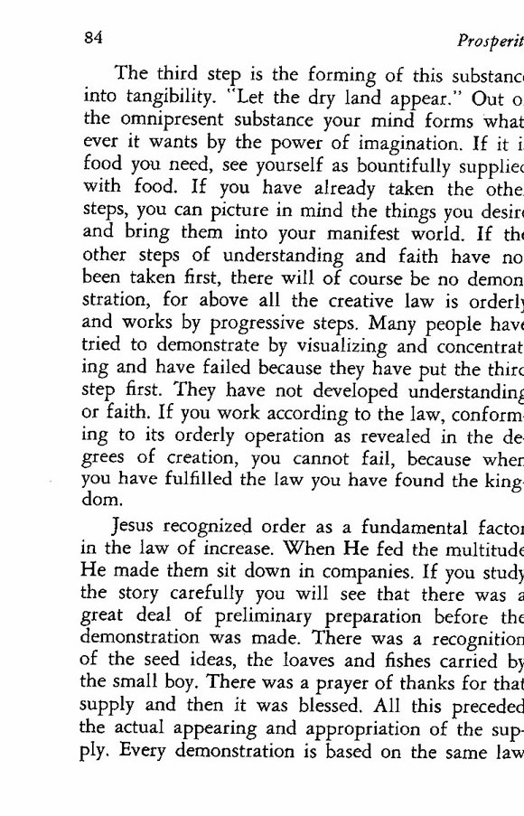 The third step is the forming of this substance into tangibility. "Let the dry land appear." Out of the omnipresent substance your mind forms whatever it wants by the power of imagination. If it is food you need, see yourself as bountifully supplied with food. If you have already taken the other steps, you can picture in mind the things you desire and bring them into your manifest world. If the other steps of understanding and faith have not been taken first, there will of course be no demonstration, for above all the creative law is orderly and works by progressive steps. Many people have tried to demonstrate by visualizing and concentrating and have failed because they have put the third step first. They have not developed understanding or faith. If you work according to the law, conforming to its orderly operation as revealed in the degrees of creation, you cannot fail, because when you have fulfilled the law you have found the kingdom.