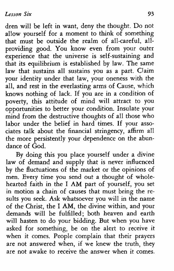 By doing this you place yourself under a divine law of demand and supply that is never influenced by the fluctuations of the market or the opinions of men. Every time you send out a thought of wholehearted faith in the I AM part of yourself, you set in motion a chain of causes that must bring the results you seek. Ask whatsoever you will in the name of the Christ, the I AM, the divine within, and your demands will be fulfilled; both heaven and earth will hasten to do your bidding. But when you have asked for something, be on the alert to receive it when it comes. People complain that their prayers are not answered when, if we knew the truth, they are not awake to receive the answer when it comes.