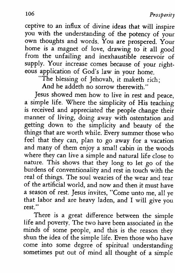 Jesus showed men how to live in rest and peace, a simple life. Where the simplicity of His teaching is received and appreciated the people change their manner of living, doing away with ostentation and getting down to the simplicity and beauty of the things that are worth while. Every summer those who feel that they can, plan to go away for a vacation and many of them enjoy a small cabin in the woods where they can live a simple and natural life close to nature. This shows that they long to let go of the burdens of conventionality and rest in touch with the real of things. The soul wearies of the wear and tear of the artificial world, and now and then it must have a season of rest. Jesus invites, "Come unto me, all ye that labor and are heavy laden, and I will give you rest."