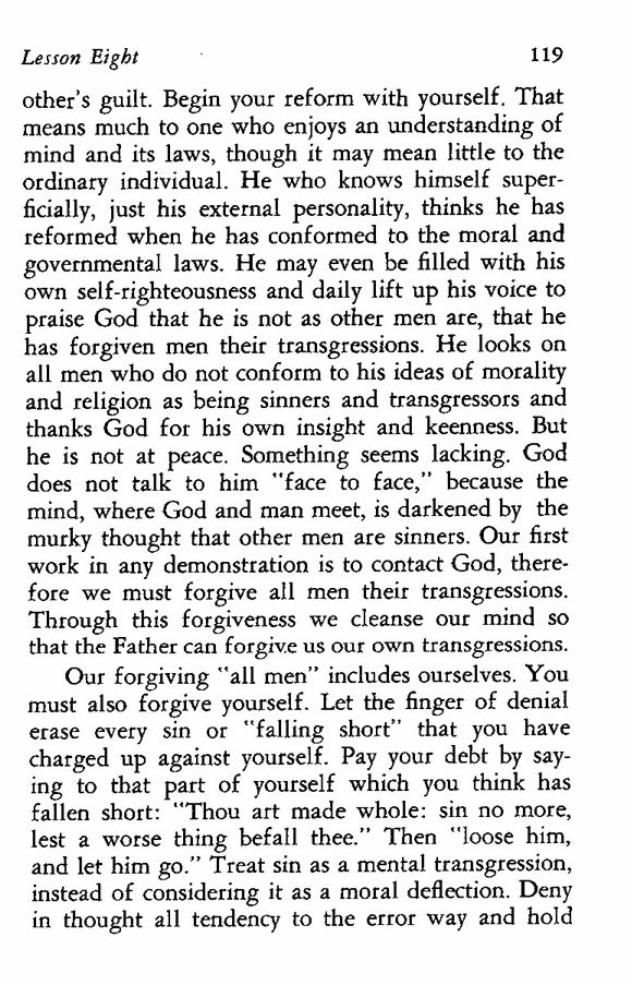 guilt. Begin your reform with yourself. That means much to one who enjoys an understanding of mind and its laws, though it may mean little to the ordinary individual. He who knows himself superficially, just his external personality, thinks he has reformed when he has conformed to the moral and governmental laws. He may even be filled with his own self-righteousness and daily lift up his voice to praise God that he is not as other men are, that he has forgiven men their transgressions. He looks on all men who do not conform to his ideas of morality and religion as being sinners and transgressors and thanks God for his own insight and keenness. But he is not at peace. Something seems lacking. God does not talk to him "face to face," because the mind, where God and man meet, is darkened by the murky thought that other men are sinners. Our first work in any demonstration is to contact God, therefore we must forgive all men their transgressions. Through this forgiveness we cleanse our mind so that the Father can forgive us our own transgressions.