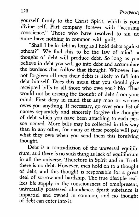 "Shall I be in debt as long as I hold debts against others?" We find this to be the law of mind: a thought of debt will produce debt. So long as you believe in debt you will go into debt and accumulate the burdens that follow that thought. Whoever has not forgiven all men their debts is likely to fall into debt himself. Does this mean that you should give receipted bills to all those who owe you? No. That would not be erasing the thought of debt from your mind. First deny in mind that any man or woman owes you anything. If necessary, go over your list of names separately and sincerely forgive the thought of debt which you have been attaching to each person named. More bills may be collected in this way than in any other, for many of these people will pay what they owe when you send them this forgiving thought.