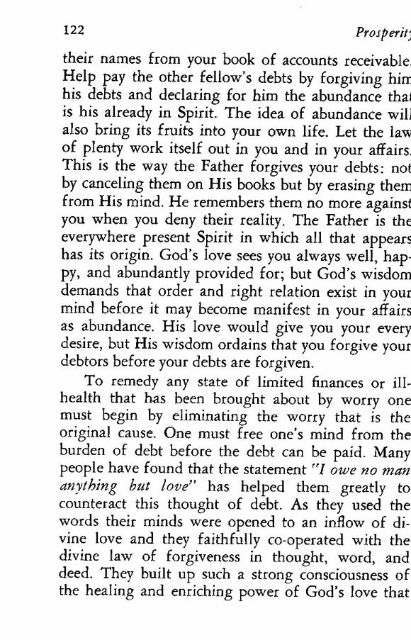 To remedy any state of limited finances or ill-health that has been brought about by worry one must begin by eliminating the worry that is the original cause. One must free one's mind from the burden of debt before the debt can be paid. Many people have found that the statement "I owe no man anything but love" has helped them greatly to counteract this thought of debt. As they used the words their minds were opened to an inflow of divine love and they faithfully co-operated with the divine law of forgiveness in thought, word, and deed. They built up such a strong consciousness of the healing and enriching power of God's love that
