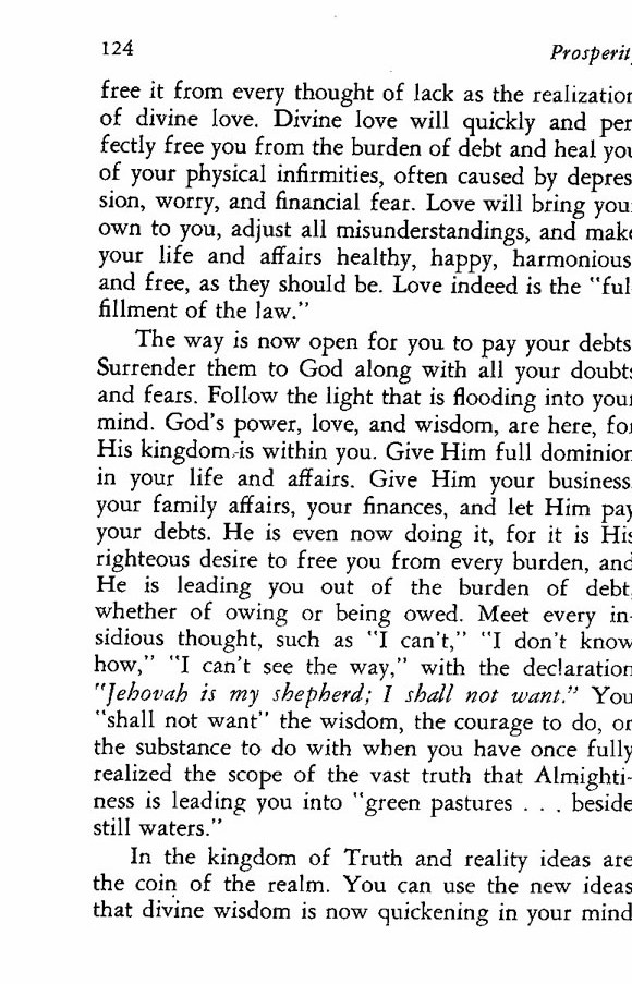 The way is now open for you to pay your debts. Surrender them to God along with all your doubts and fears. Follow the light that is flooding into your mind. God's power, love, and wisdom, are here, for His kingdom is within you. Give Him full dominion in your life and affairs. Give Him your business, your family affairs, your finances, and let Him pay your debts. He is even now doing it, for it is His righteous desire to free you from every burden, and He is leading you out of the burden of debt, whether of owing or being owed. Meet every insidious thought, such as "I can't," "I don't know how," "I can't see the way," with the declaration "Jehovah is my shepherd; I shall not want." You "shall not want" the wisdom, the courage to do, or the substance to do with when you have once fully realized the scope of the vast truth that Almightiness is leading you into "green pastures ... beside still waters."