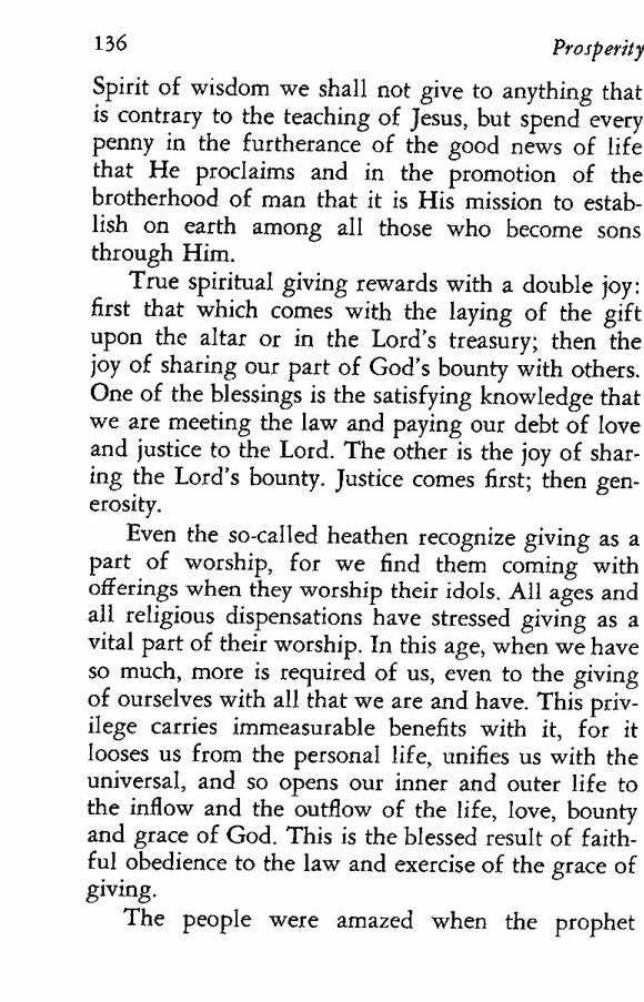 Even the so-called heathen recognize giving as a part of worship, for we find them coming with offerings when they worship their idols. All ages and all religious dispensations have stressed giving as a vital part of their worship. In this age, when we have so much, more is required of us, even to the giving of ourselves with all that we are and have. This privilege carries immeasurable benefits with it, for it looses us from the personal life, unifies us with the universal, and so opens our inner and outer life to the inflow and the outflow of the life, love, bounty and grace of God. This is the blessed result of faithful obedience to the law and exercise of the grace of giving.
