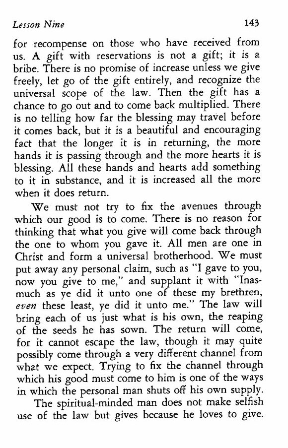 We must not try to fix the avenues through which our good is to come. There is no reason for thinking that what you give will come back through the one to whom you gave it. All men are one in Christ and form a universal brotherhood. We must put away any personal claim, such as "I gave to you, now you give to me," and supplant it with "Inasmuch as ye did it unto one of these my brethren, even these least, ye did it unto me." The law will bring each of us just what is his own, the reaping of the seeds he has sown. The return will come, for it cannot escape the law, though it may quite possibly come through a very different channel from what we expect. Trying to fix the channel through which his good must come to him is one of the ways in which the personal man shuts off his own supply.