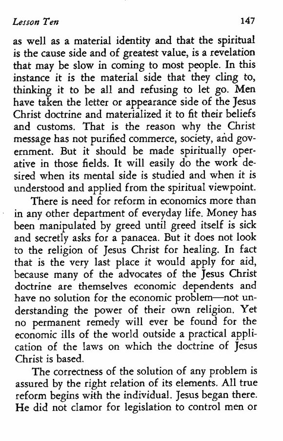 There is need for reform in economics more than in any other department of everyday life. Money has been manipulated by greed until greed itself is sick and secretly asks for a panacea. But it does not look to the religion of Jesus Christ for healing. In fact that is the very last place it would apply for aid, because many of the advocates of the Jesus Christ doctrine are themselves economic dependents and have no solution for the economic problem--not understanding the power of their own religion. Yet no permanent remedy will ever be found for the economic ills of the world outside a practical application of the laws on which the doctrine of Jesus Christ is based.