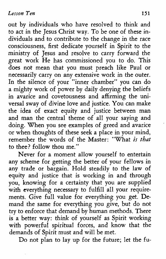 out by individuals who have resolved to think and to act in the Jesus Christ way. To be one of these individuals and to contribute to the change in the race consciousness, first dedicate yourself in Spirit to the ministry of Jesus and resolve to carry forward the great work He has commissioned you to do. This does not mean that you must preach like Paul or necessarily carry on any extensive work in the outer. In the silence of your "inner chamber" you can do a mighty work of power by daily denying the beliefs in avarice and covetousness and affirming the universal sway of divine love and justice. You can make the idea of exact equity and justice between man and man the central theme of all your saying and doing. When you see examples of greed and avarice or when thoughts of these seek a place in your mind, remember the words of the Master: "What is that to thee? follow thou me."