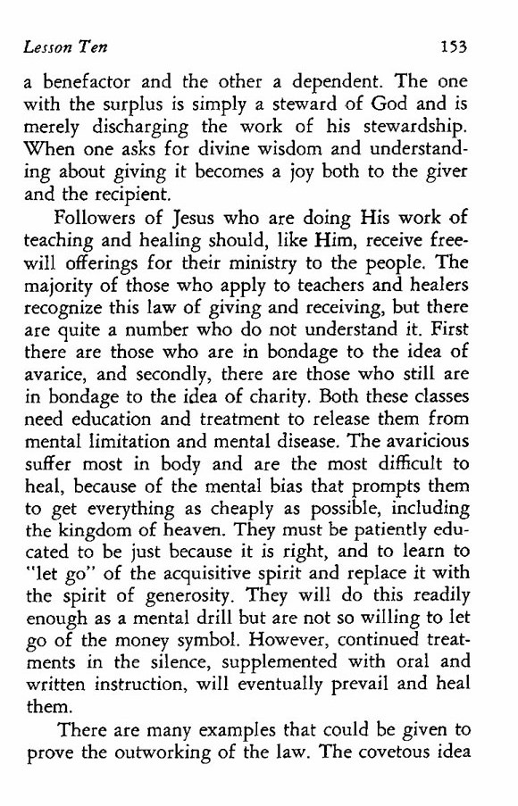 Followers of Jesus who are doing His work of teaching and healing should, like Him, receive free-will offerings for their ministry to the people. The majority of those who apply to teachers and healers recognize this law of giving and receiving, but there are quite a number who do not understand it. First there are those who are in bondage to the idea of avarice, and secondly, there are those who still are in bondage to the idea of charity. Both these classes need education and treatment to release them from mental limitation and mental disease. The avaricious suffer most in body and are the most difficult to heal, because of the mental bias that prompts them to get everything as cheaply as possible, including the kingdom of heaven. They must be patiently educated to be just because it is right, and to learn to "let go" of the acquisitive spirit and replace it with the spirit of generosity. They will do this readily enough as a mental drill but are not so willing to let go of the money symbol. However, continued treatments in the silence, supplemented with oral and written instruction, will eventually prevail and heal them.