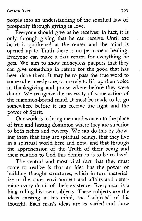 Everyone should give as he receives; in fact, it is only through giving that he can receive. Until the heart is quickened at the center and the mind is opened up to Truth there is no permanent healing. Everyone can make a fair return for everything he gets. We aim to show moneyless paupers that they can give something in return for the good that has been done them. It may be to pass the true word to some other needy one, or merely to lift up their voice in thanksgiving and praise where before they were dumb. We recognize the necessity of some action of the mammon-bound mind. It must be made to let go somewhere before it can receive the light and the power of Spirit.