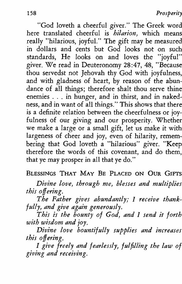 "God loveth a cheerful giver." The Greek word here translated cheerful is hilarion, which means really "hilarious, joyful." The gift may be measured in dollars and cents but God looks not on such standards, He looks on and loves the "joyful" giver. We read in Deuteronomy 28:47, 48, "Because thou servedst not Jehovah thy God with joyfulness, and with gladness of heart, by reason of the abundance of all things; therefore shalt thou serve thine enemies ... in hunger, and in thirst, and in nakedness, and in want of all things." This shows that there is a definite relation between the cheerfulness or joyfulness of our giving and our prosperity. Whether we make a large or a small gift, let us make it with largeness of cheer and joy, even of hilarity, remembering that God loveth a "hilarious" giver. "Keep therefore the words of this covenant, and do them, that ye may prosper in all that ye do."