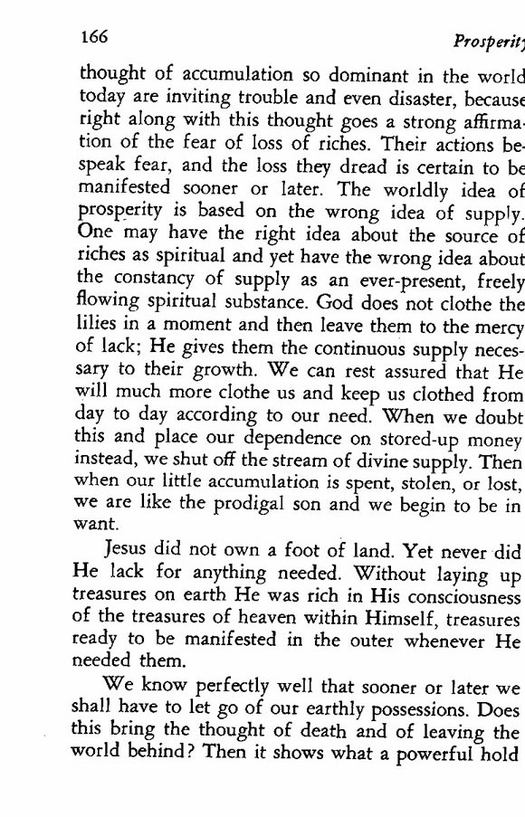 thought of accumulation so dominant in the world today are inviting trouble and even disaster, because right along with this thought goes a strong affirmation of the fear of loss of riches. Their actions bespeak fear, and the loss they dread is certain to be manifested sooner or later. The worldly idea of prosperity is based on the wrong idea of supply. One may have the right idea about the source of riches as spiritual and yet have the wrong idea about the constancy of supply as an ever-present, freely flowing spiritual substance. God does not clothe the lilies in a moment and then leave them to the mercy of lack; He gives them the continuous supply necessary to their growth. We can rest assured that He will much more clothe us and keep us clothed from day to day according to our need. When we doubt this and place our dependence on stored-up money instead, we shut off the stream of divine supply. Then when our little accumulation is spent, stolen, or lost, we are like the prodigal son and we begin to be in want.