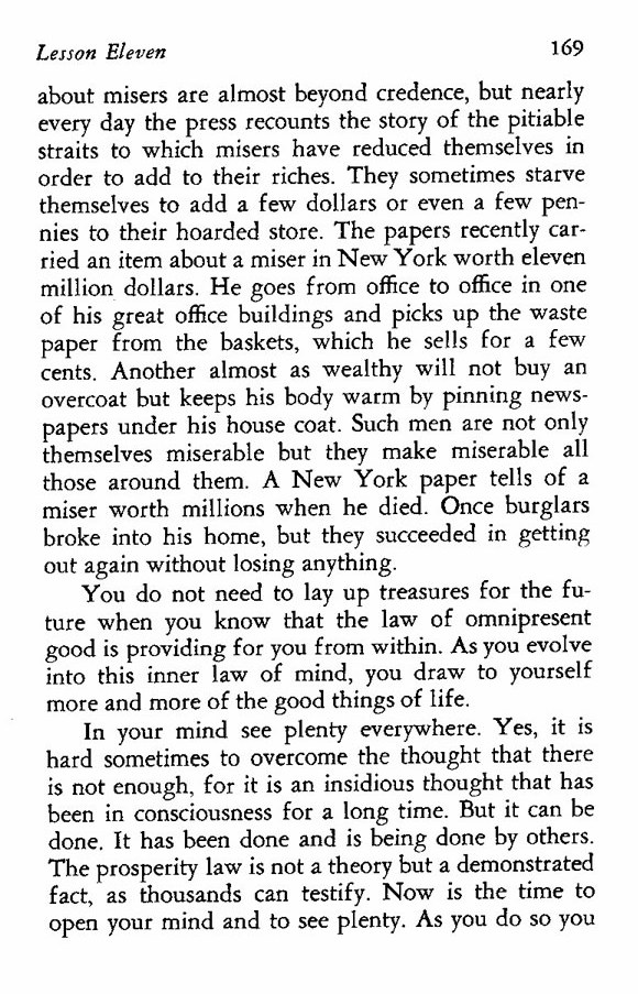 In your mind see plenty everywhere. Yes, it is hard sometimes to overcome the thought that there is not enough, for it is an insidious thought that has been in consciousness for a long time. But it can be done. It has been done and is being done by others. The prosperity law is not a theory but a demonstrated fact, as thousands can testify. Now is the time to open your mind and to see plenty. As you do so you