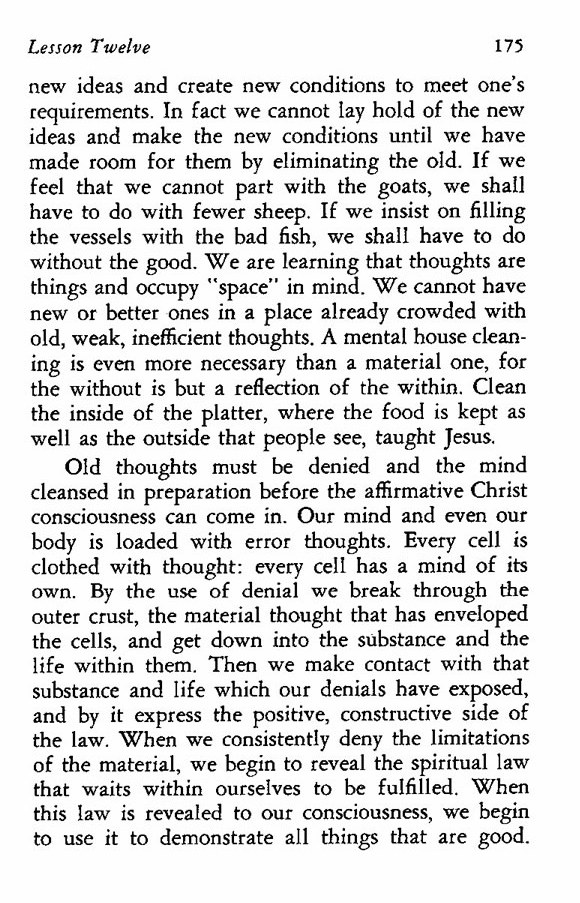 Old thoughts must be denied and the mind cleansed in preparation before the affirmative Christ consciousness can come in. Our mind and even our body is loaded with error thoughts. Every cell is clothed with thought: every cell has a mind of its own. By the use of denial we break through the outer crust, the material thought that has enveloped the cells, and get down into the substance and the life within them. Then we make contact with that substance and life which our denials have exposed, and by it express the positive, constructive side of the law. When we consistently deny the limitations of the material, we begin to reveal the spiritual law that waits within ourselves to be fulfilled. When this law is revealed to our consciousness, we begin to use it to demonstrate all things that are good.