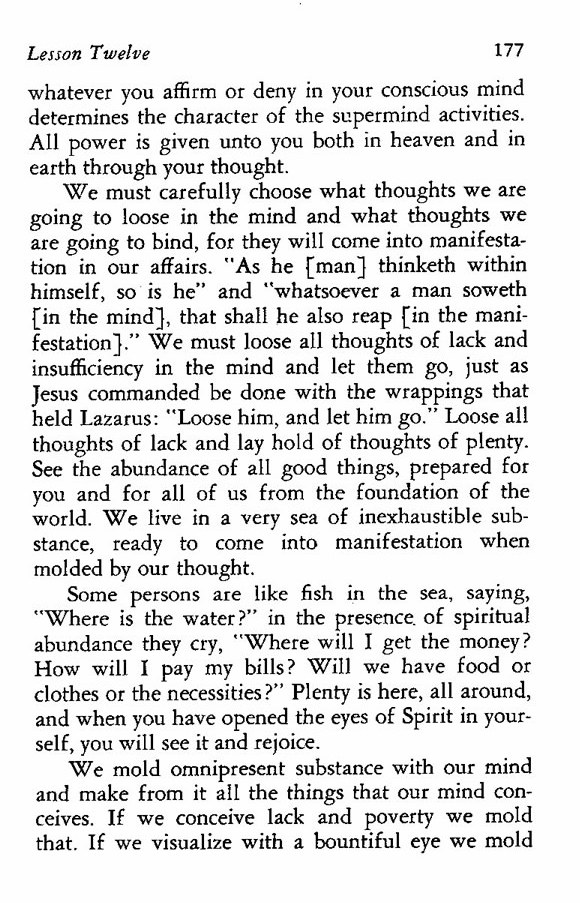 We must carefully choose what thoughts we are going to loose in the mind and what thoughts we are going to bind, for they will come into manifestation in our affairs. "As he [man] thinketh within himself, so is he" and "whatsoever a man soweth [in the mind], that shall he also reap [in the manifestation]." We must loose all thoughts of lack and insufficiency in the mind and let them go, just as Jesus commanded be done with the wrappings that held Lazarus: "Loose him, and let him go." Loose all thoughts of lack and lay hold of thoughts of plenty. See the abundance of all good things, prepared for you and for all of us from the foundation of the world. We live in a very sea of inexhaustible substance, ready to come into manifestation when molded by our thought.