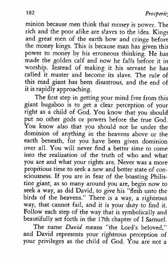 The first step in getting your mind free from this giant bugaboo is to get a clear perception of your right as a child of God. You know that you should put no other gods or powers before the true God. You know also that you should not be under the dominion of anything in the heavens above or the earth beneath, for you have been given dominion over all. You will never find a better time to come into the realization of the truth of who and what you are and what your rights are. Never was a more propitious time to seek a new and better state of consciousness. If you are in fear of the boasting Philistine giant, as so many around you are, begin now to seek a way, as did David, to give his "flesh unto the birds of the heavens." There is a way, a righteous way, that cannot fail, and it is your duty to find it. Follow each step of the way that is symbolically and beautifully set forth in the 17th chapter of I Samuel.