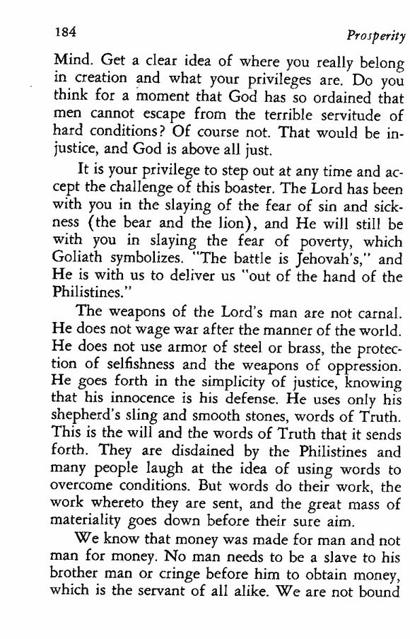 It is your privilege to step out at any time and accept the challenge of this boaster. The Lord has been with you in the slaying of the fear of sin and sickness (the bear and the lion), and He will still be with you in slaying the fear of poverty, which Goliath symbolizes. "The battle is Jehovah's," and He is with us to deliver us "out of the hand of the Philistines."