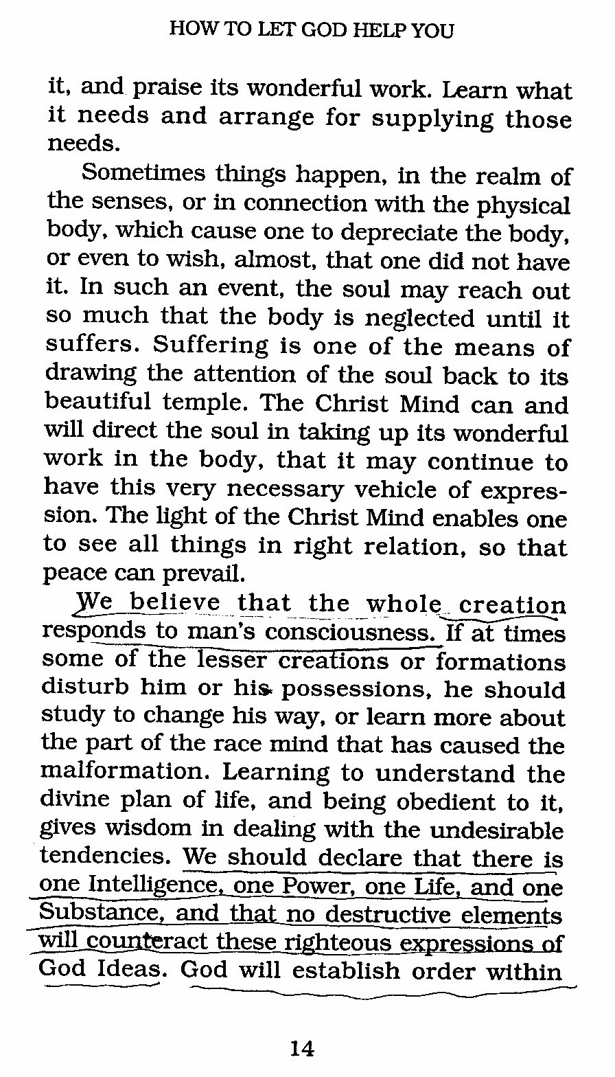 We believe that the whole creation responds to man's consciousness. If at times some of the lesser creations or formations disturb him or his possessions, he should study to change his way, or learn more about the part of the race mind that has caused the malformation. Learning to understand the divine plan of life, and being obedient to it, gives wisdom in dealing with the undesirable tendencies. We should declare that there is one Intelligence, one Power, one Life, and one Substance, and that no destructive elements will counteract these righteous God Ideas. God will establish order within